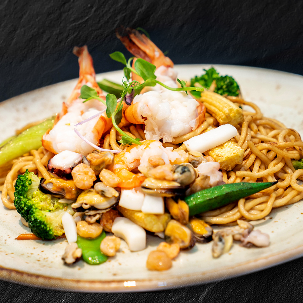 GEBRATENE NUDELN MIT GEGRILLTEM MEERESFRÜCHTEN
